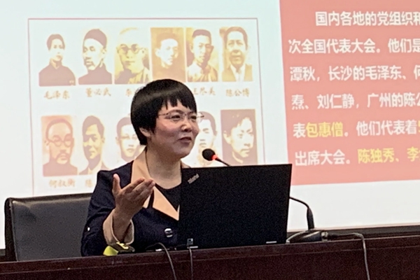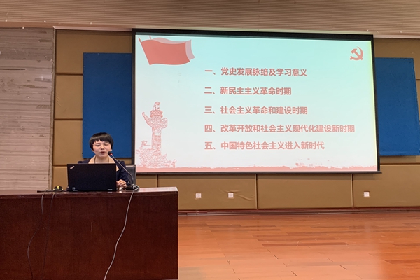 谢教授的宣讲报告从党史发展脉络及学习意义、新民主主义革命时期、社会主义革命和建设时期、改革开放和社会主义现代化建设新时期及中国特色社会主义进入新时代五方面展开。会上,谢教授按时间顺序梳理了中国共产党建党一百年来的光辉历程;带领现场师生重温了南昌起义、秋收起义、八七会议、三湾改编、遵义会议、西安事变及三大战役等著名历史事件;就改革开放、中国特色社会主义进入新时代及党的十九大等历史上的重要时间节点进行了强调。此外,她还向在场师生推荐一部电视剧《觉醒年代》。最后,谢教授为助力现场学生代表的成长成才送上五个原则,即结交两个好友:图书馆和运动场;培养两种本领:本分和本事;插上两个翅膀:理想和毅力;爱吃两样东西:吃亏和吃苦;配备两大保镖:运动和乐观。
