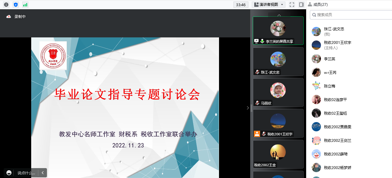11月23日下午,教师教学发展中心、李兰英名师工作室、财税系联合税收工作室以线上形式举办2023届毕业论文指导专题研讨会。财税系全体教师及税收工作室部分学生参会,李兰英教授主持。