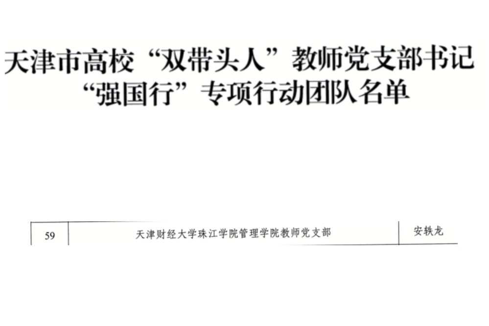 近日,在教育部和市教育两委组织开展的“双带头人”教师党支部书记“强国行”专项行动中,我院管理学院教师党支部成功入选天津市“强国行”专项行动团队。