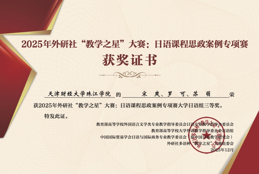 近日,2025年外研社“教学之星”大赛:日语课程思政案例专项赛获奖名单公布,人文学院外语系日语教研室两支教师团队分别荣获日语专业组全国三等奖和大学日语组全国三等奖。