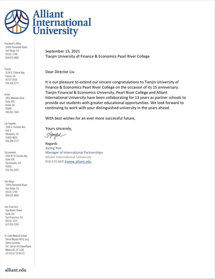 美国阿兰特国际大学贺信内容