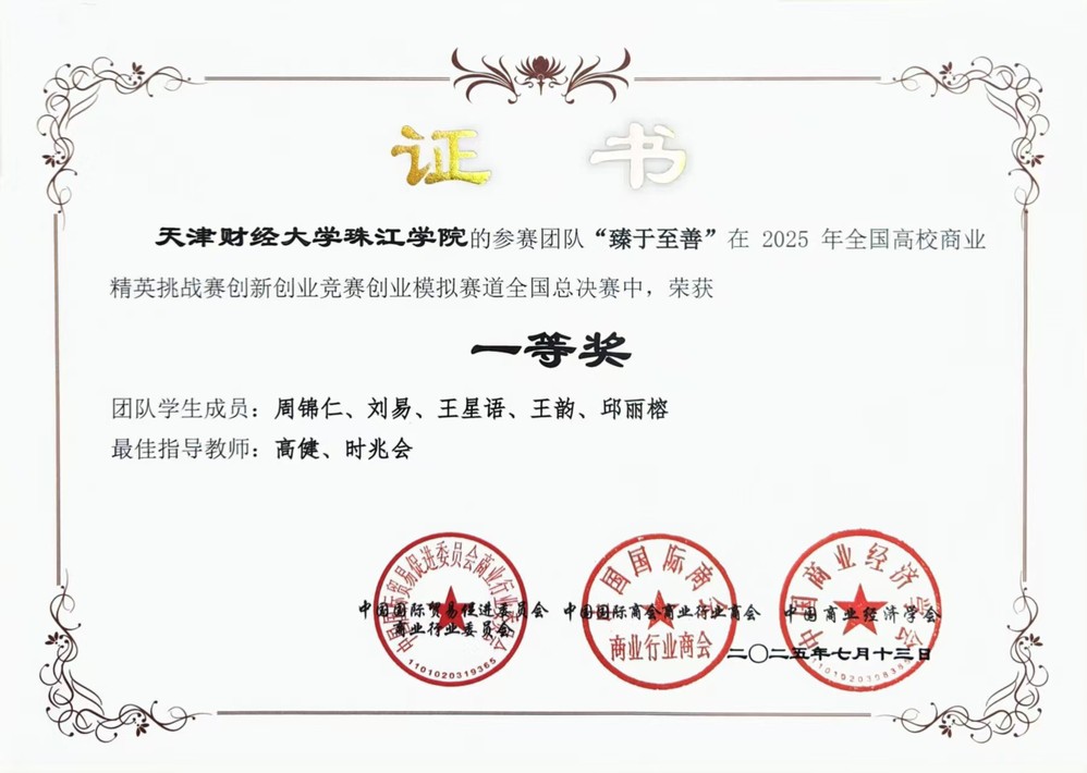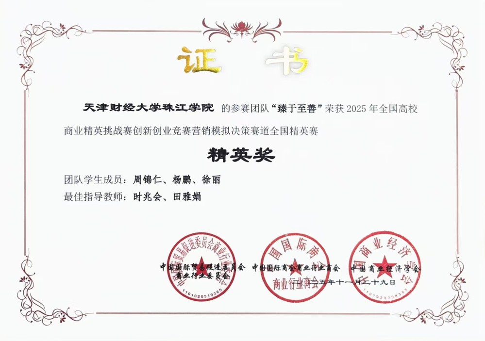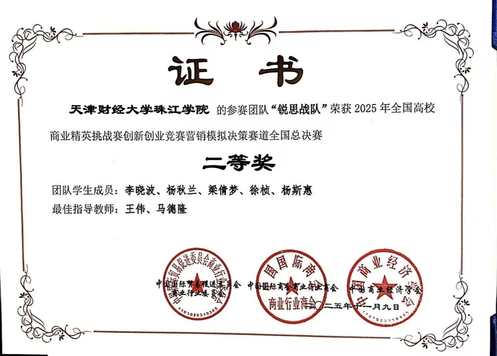 全国商业精英挑战赛创新创业竞赛是国内高校创新创业领域的标杆赛事之一,覆盖创业、营销、流通等多个赛道,位列教育部大学生榜单第47项。该赛事要求团队在限定周期内完成全链条商业决策,同时应对市场不确定性,全方位考察学生商科实战能力与团队协作水平,是高校商科学生的 “实战练兵场”,在教育界与行业内认可度颇高。