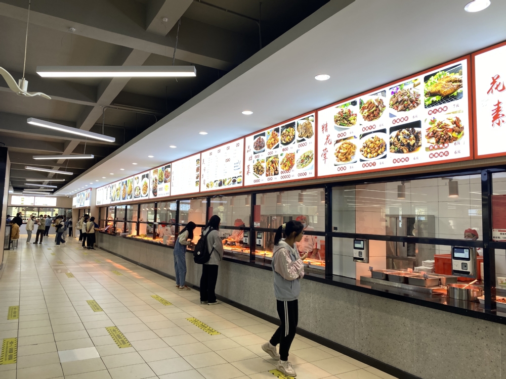 餐厅除大锅菜以外另设有风味小吃,窗口共计17个,如:重庆小面、海族拌面、清真餐厅、掉渣饼、好享扒饭、招牌鱼粉、麻辣烫、米掌门煲仔饭、津菜道、削味斋、金陵鸭血粉丝汤、精花荤、初心一碗面、花素、素菜、美味早餐、品牌菜等。从口味上满足南北地域师生的需求,优美且干净整洁的就餐环境使学生拥有了归属感。