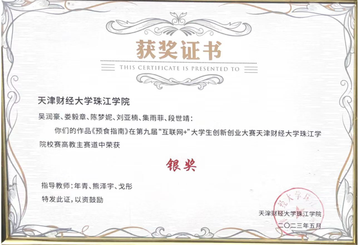 “预食指南”项目荣获第九届“互联网+”大学生创新创业大赛高教主赛道yabo鸭脖官网校赛银奖、天津市铜奖。
