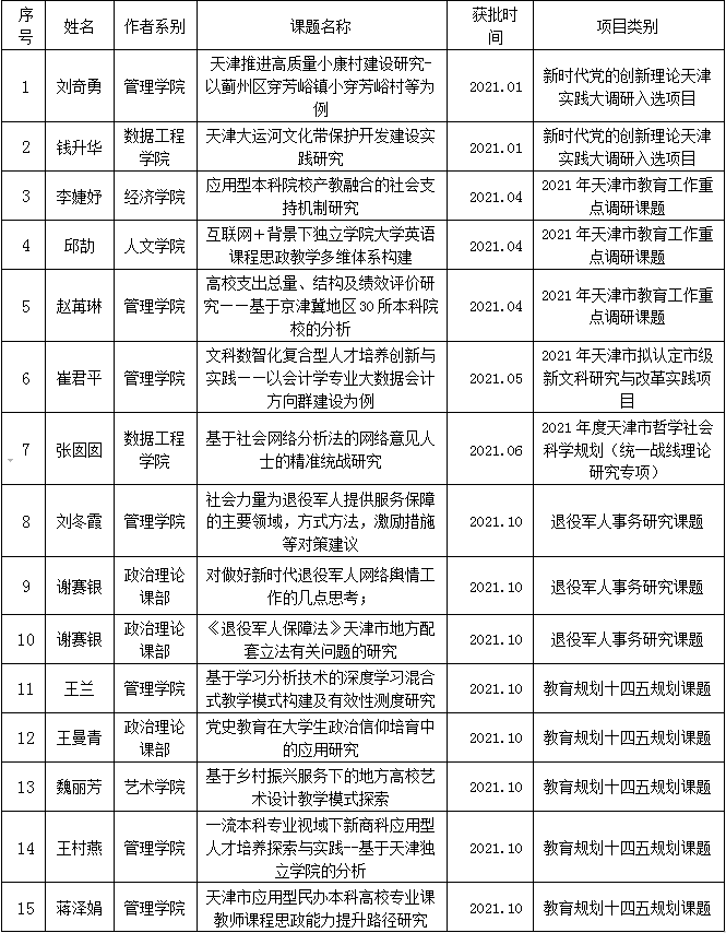 近年来学院加大科研经费投入,各二级学院和教学部在组织教师圆满完成教学工作的同时,鼓励教师结合学科发展开展科学研究,申报承担科研课题。到10月份,今年我院教师共获批局级以上课题15项,其中省部级课题7项。王兰,王曼青,魏丽芳,王村燕,蒋泽娟五位教师获批天津市教育科学“十四五”规划课题立项,在本次申报活动中,全院19名教师提交申报书,立项率26.31% 。年初,市教委组织申报教育部新文科研究与改革实践项目,全市民办高校总计获批3项,我院崔君平教授的课题榜上有名。六月份,天津市哲学社会科学规划办公室组织统一战线理论专项研究课题申报,我院青年教师张囡囡荣获立项,是唯一立项的民办大学。在新时代党的创新理论天津实践大调研项目申报中,我院刘奇勇、钱升华二位教师获批立项。在市委教育工委、市教委组织的2021年天津市教育工作重点调研课题申报活动中,我院李婕妤、邱劼、赵苒琳三位老师获批立项。