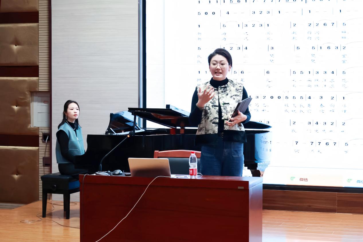 在美学素养讲座中,艺术学院副院长、名师工作室负责人曹鹏飞副教授结合学院人才培养实际,从指导思想、核心概念、历史源流、时代价值等方面系统解读美学素养的重要性。为了让新入职教职工从理论认知延伸至实践感知,在艺术学院李雅菲、郭雨轩两位老师指导下开展校歌学唱活动,通过歌词解读与旋律赏析,感悟校园文化内涵。