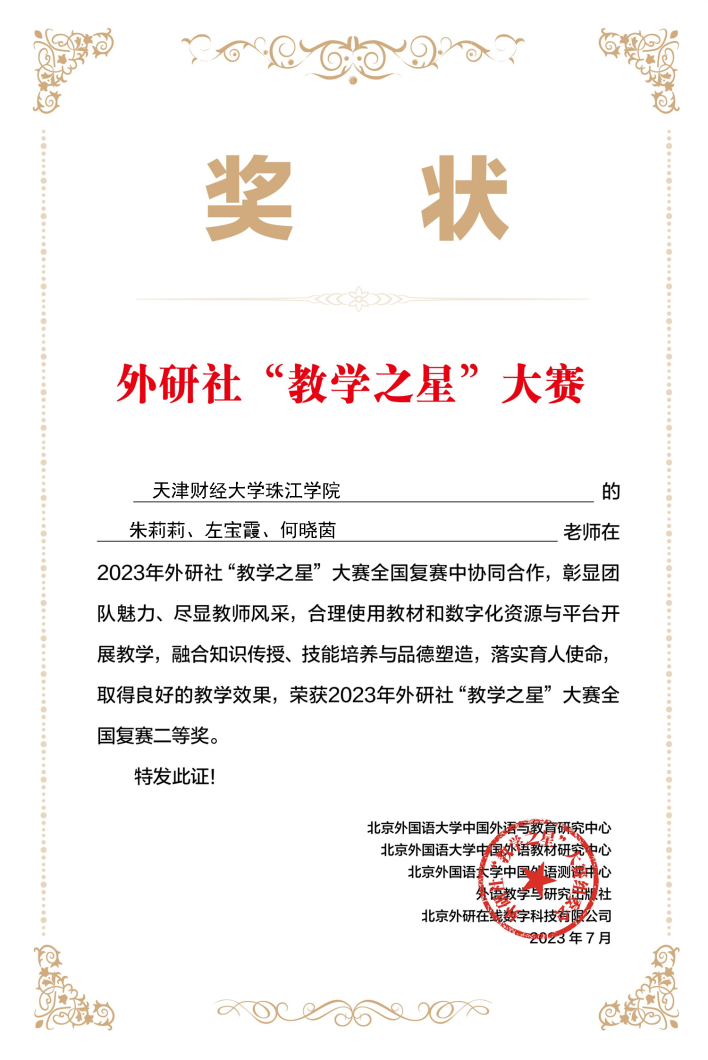 2023年6月,外研社“教学之星”全国复赛落下帷幕。人文学院外语系教师朱莉莉、左宝霞、何晓茵荣获2023年外研社“教学之星”大赛全国复赛二等奖。