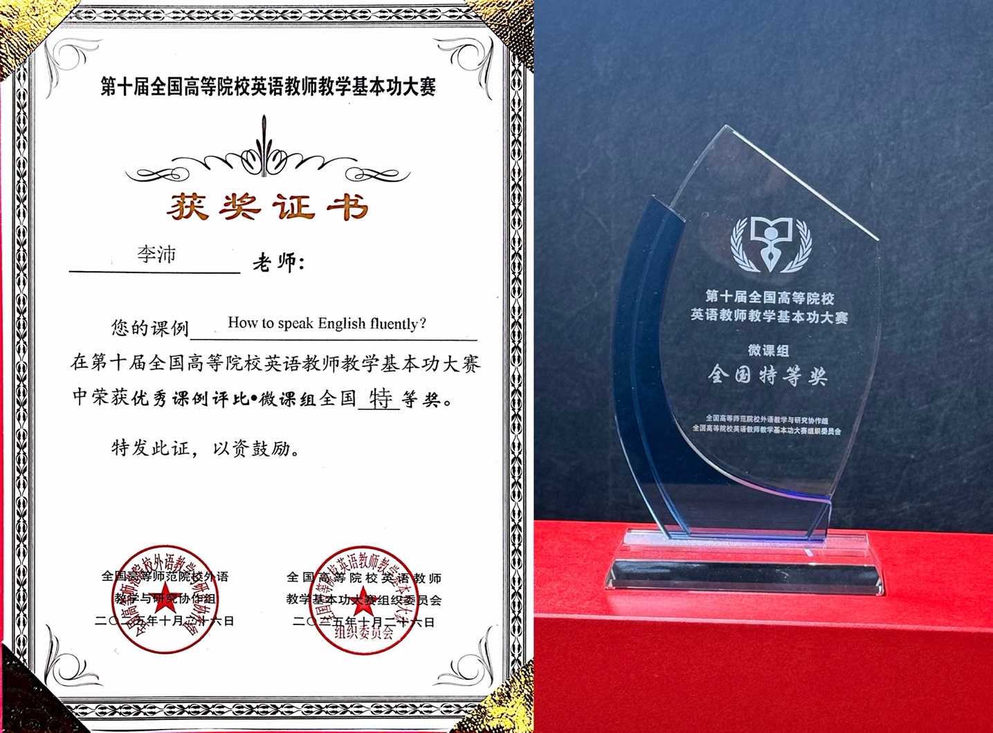 2025年10月23日至26日,第十届全国高等院校英语教师教学基本功大赛全国总决赛在南京理工大学举行。我院人文学院公共英语教学部教师李沛凭借扎实的教学功底和突出的创新能力,在全国总决赛中脱颖而出,荣获全国特等奖。这一成绩充分展示了我院教师在高校英语教学领域的专业实力与创新风采,为学院赢得了荣誉。