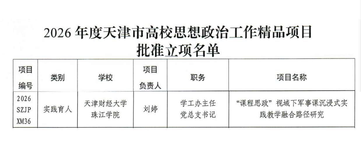 近日,中共天津市委教育工委、天津市教育委员会联合印发《2026 年度天津市高校思想政治工作精品项目立项名单》,珠江学院人文学院党总支书记、学工办主任刘婷主持的《“课程思政” 视域下军事课沉浸式实践教学融合路径研究》项目成功获批立项,为学院高质量发展再添重要实绩。