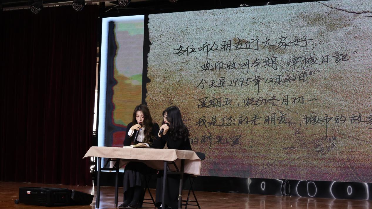 汇报展以报考传播学专业的准大学生 “小津” 和 “小悦” 为叙事线索,以从事新闻工作的父辈留下的工作笔记为载体,通过 “笔记本的传承” 这一主线,串联起天津不同时代的传播图景。展演创新融合舞台剧、H5 动画、非遗展示、AI 数字人等多元表现形式,打破时空界限,开启了一场“用传播学视角解码天津”的跨时空对话。