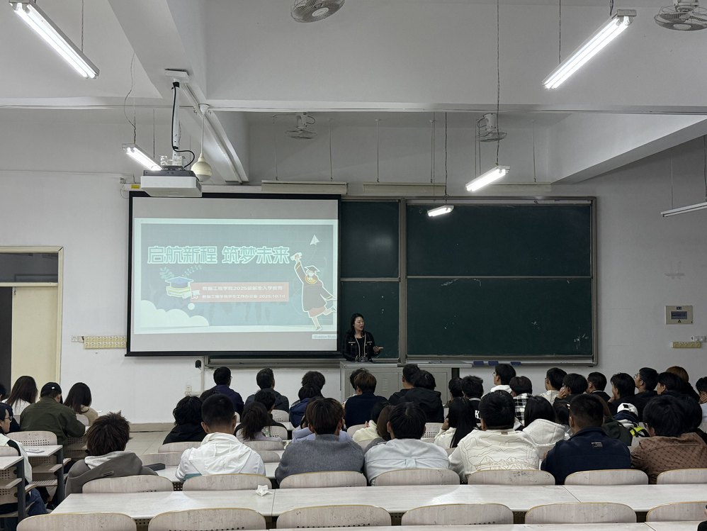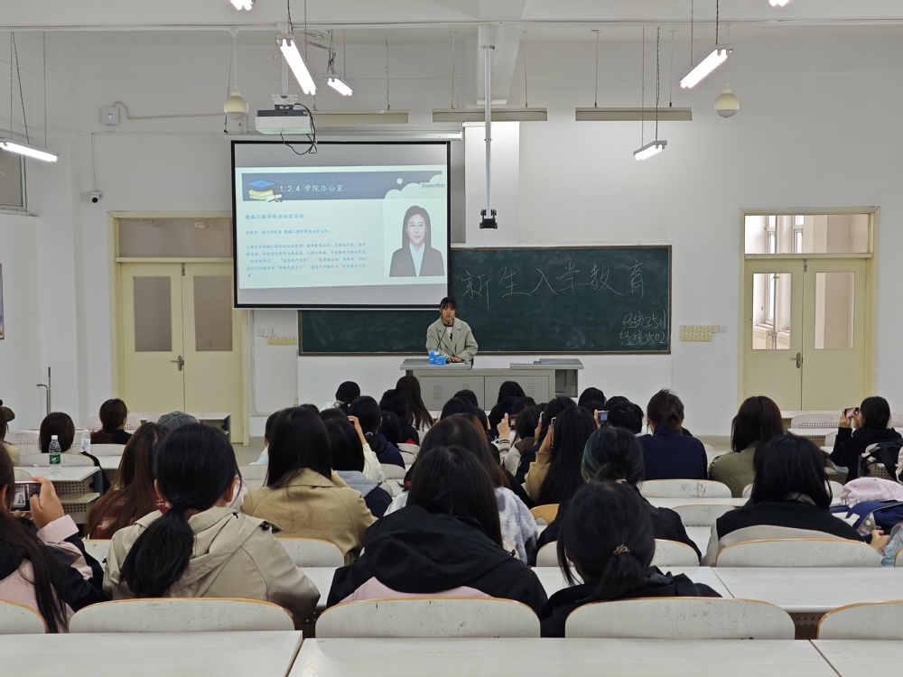 为引导2025级新生坚定理想信念、快速适应大学环境、科学规划学业生涯,数据工程学院学工办于10月10日举行新生入学教育活动。本次活动由数据工程学院学工办主任汪晓薇组织牵头,辅导员李畅、李宝亮、孙浩然、李敏、赵营营共同参与。以“启航新程,筑梦未来”为主题,紧密围绕认知引领、学业导航、生活指南、安全相伴与成长规划五大模块,为全体新生上了一堂有高度、有深度、有温度的大学生涯“第一课”。