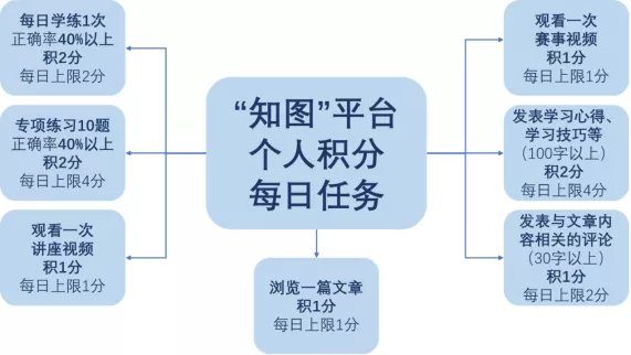 本校学生在北京搜知数据科技有限公司“知图”平台(http://www.sozdata.com)信息素养模块下通过答题、在线学习、参加考试、内容创作等方式获取积分。积分获取途径及相应分值如下: