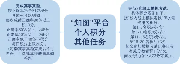 注:个人的积分及积分排名情况将通过“知图”平台实时发布,各参赛个人均可通过“知图”平台进行实时查询。完成初赛的选手总积分满330分可获得相应学时。按照成绩排名靠前优先组队,经过综合评定推荐参加全国总决赛。进入决赛的同学再获得相应学时,两次学时可累计。学生获得学时用于兑换二课堂相应学分奖励,最终解释权归图书馆所有。(详情进群咨询)