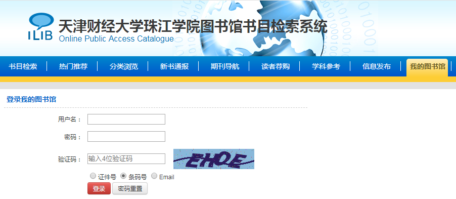 二、点击“我的图书馆”进入登录页面,请在用户名框内输入学生证号,密码请输入身份证后六位数,选择条码号登陆,进入“我的图书馆”,进行实名认证并更改用户密码。