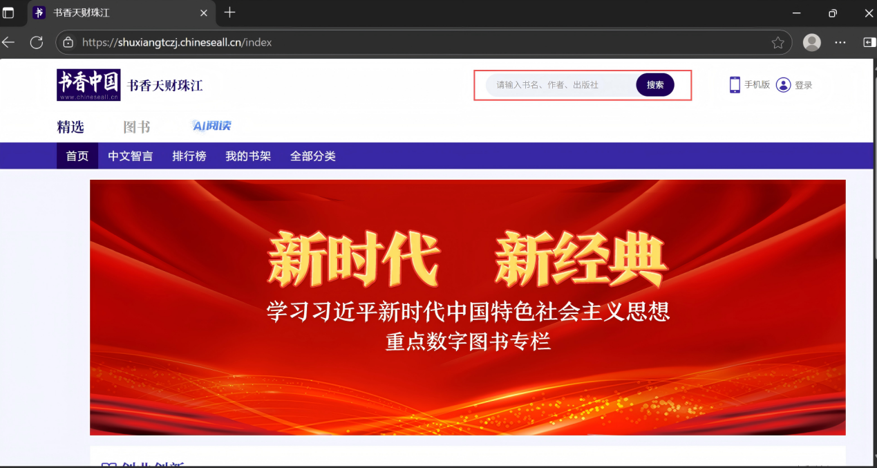 方式1:登录书香天财珠江,在首页红框内直接输入图书名称进行检索,如图3-1