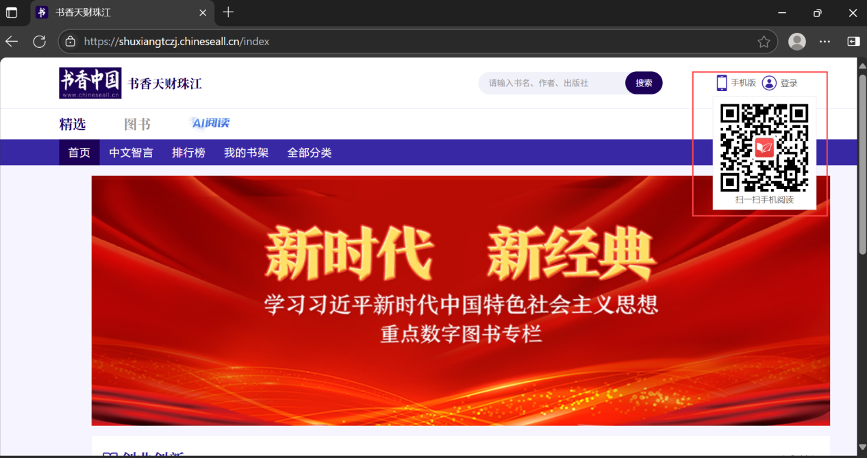 (3)登录完成后可进行图书阅读操作,如有需要移动端阅读,可把光标移动到首页右上角的手机版上,会出现二维码,微信扫一扫进行扫码下载,如图2-2。