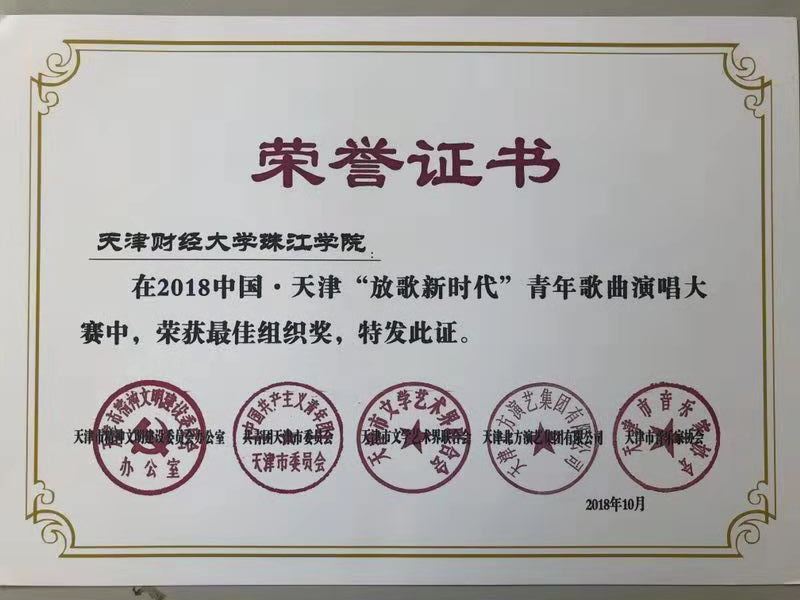 2018年10月13日,由天津市精神文明建设委员会办公室、共青团天津市委员会、天津北方演艺集团、天津市文学艺术界联合会主办,天津青年友好使者艺术团、天津青年宫、天津市音乐家协会、天津广播电视台音乐广播承办的2018中国•天津“放歌新时代”青年歌曲演唱大赛落下帷幕。我院学生荣获最佳组织奖。