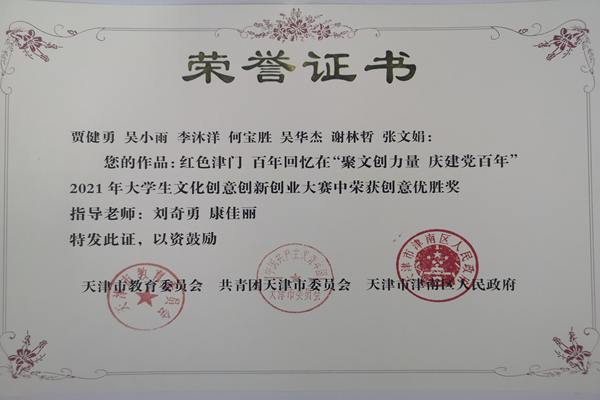 2021年6月,由天津市教育委员会、共青团天津市委员会和天津市津南区人民政府主办的“聚文创力量 庆建党百年”2021年大学生文化创意创新创业大赛圆满结束。我院有两个项目获奖,其中二等奖1项、创意优胜奖1项。