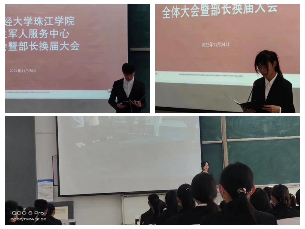 2022年11月24日,中午12点40分,召开大学生军人服务中心全体大会暨部长换届大会,会议在日新楼209举行,由大学生军人服务中心宣传部成员杨凡主持,武装部阳涛老师、张静老师出席本次会议,大学生军人服务中心全体成员参加会议。