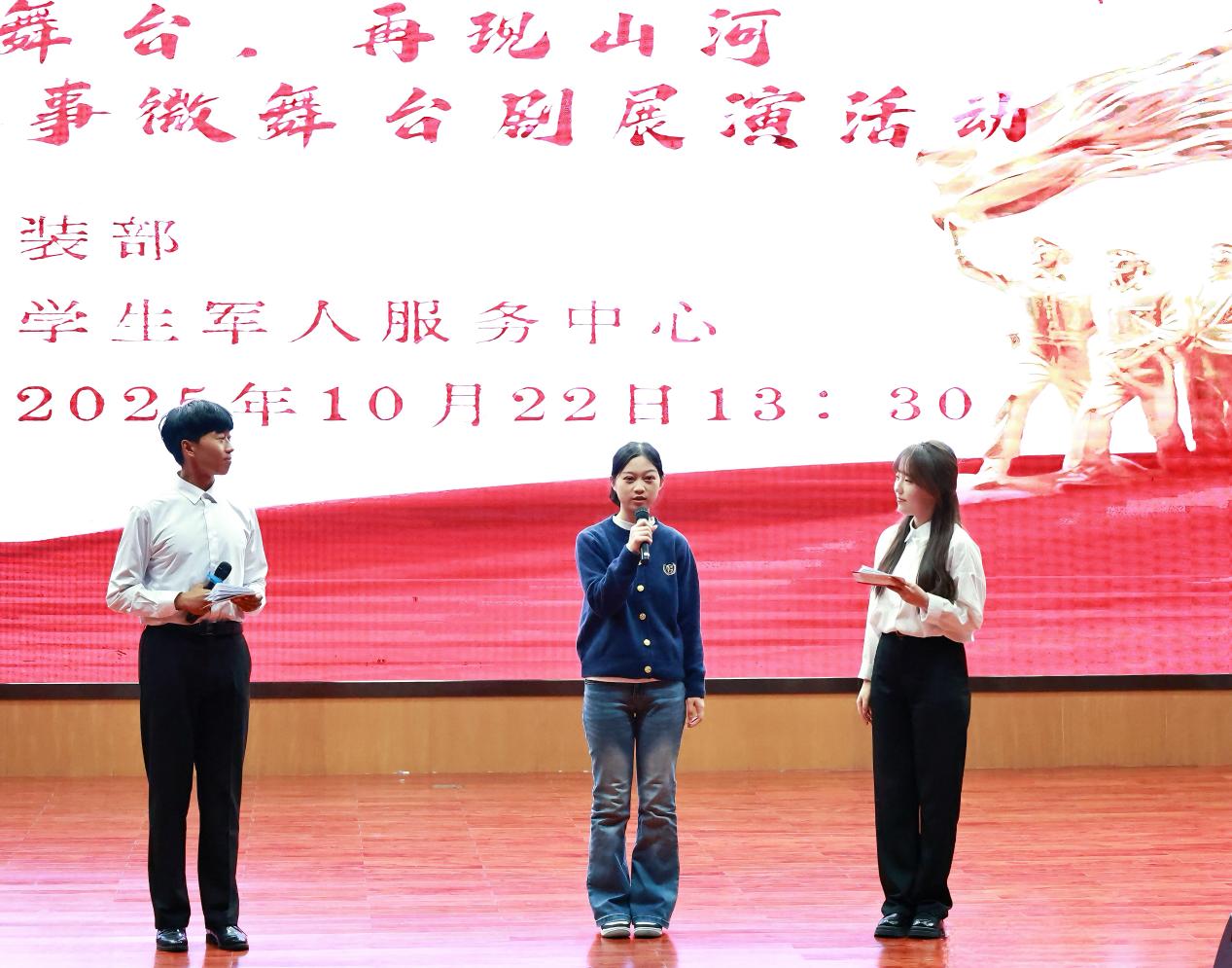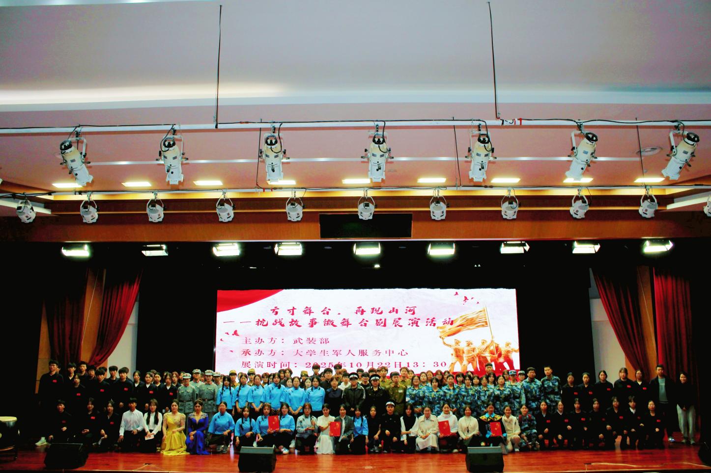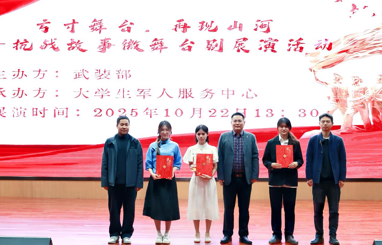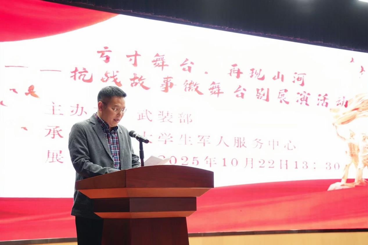 为纪念中国人民抗日战争暨世界反法西斯战争胜利80周年,2025年10月22日,国防教育宣传月之“方寸舞台,再现山河”抗战故事微舞台剧展演活动在我院中和楼报告厅隆重举行。师生齐聚一堂,在庄严肃穆的氛围中共同追溯抗战岁月,深切感悟革命先辈的英勇精神与深沉的家国情怀。