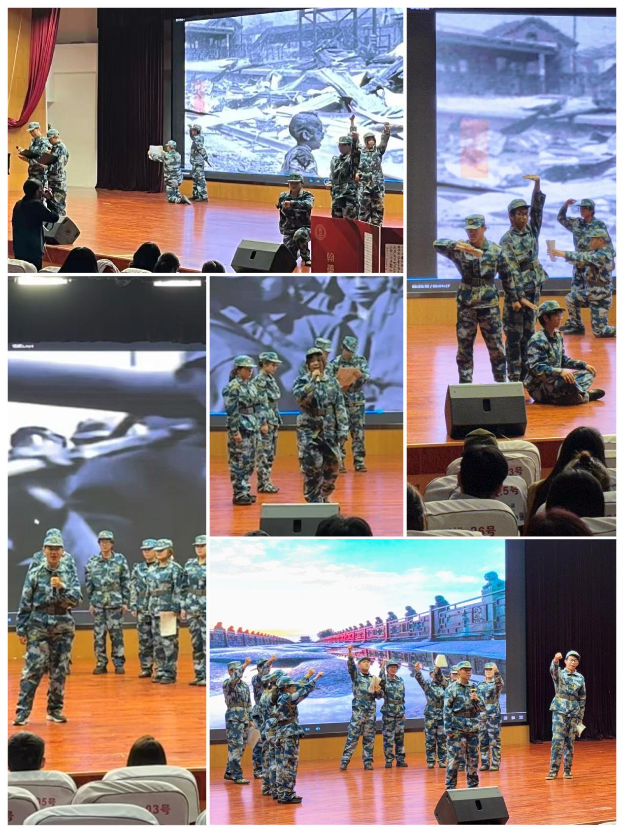 展演现场,各学院代表队倾情演绎,呈现了一幕幕感人至深的历史片段。艺术学院《家国回响:抗战记忆诵》生动再现了冀中军民地道战的智慧与坚韧;数据工程学院《炬火照山河》激昂展现了1919年爱国青年“以笔为刃”的热血激情;大学生军人服务中心陶怡然同学的朗诵《黑土地上的呐喊》,以731部队罪行的历史铁证发出“铭记真相、捍卫和平”的时代强音。