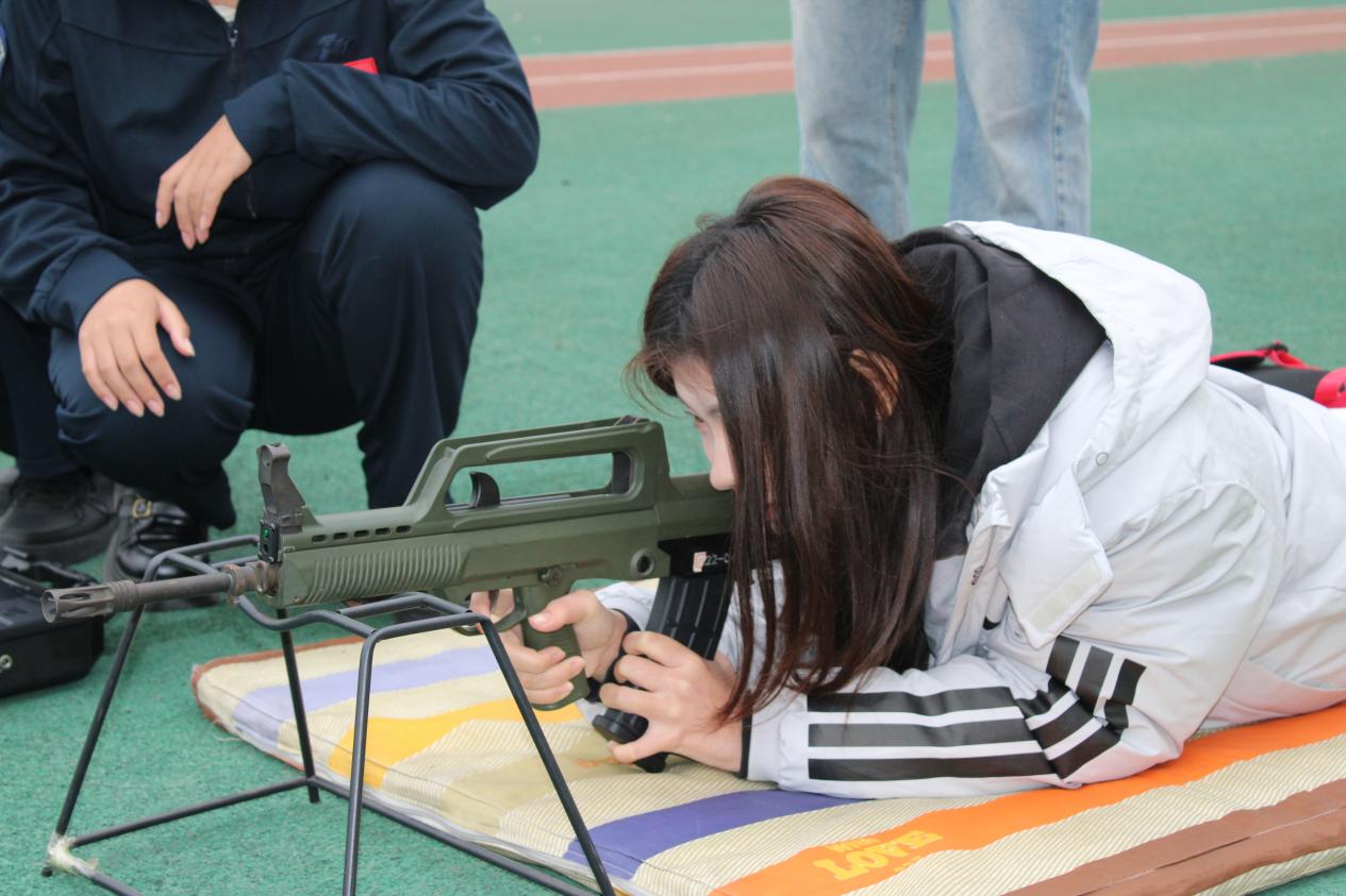 田径场塑胶跑道上,墨绿色靶纸与模拟枪械整齐排列。在大学生军人服务中心同学的指引下,参赛选手依次进入射击区域,俯身卧倒,进入射击准备状态。指导人员穿梭于各射击位间,细致纠正姿势、讲解动作要领,确保每位选手掌握基本操作规范。
