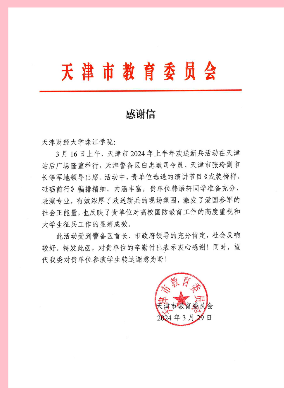 2024年天津市教育委员会向学院发来感谢信