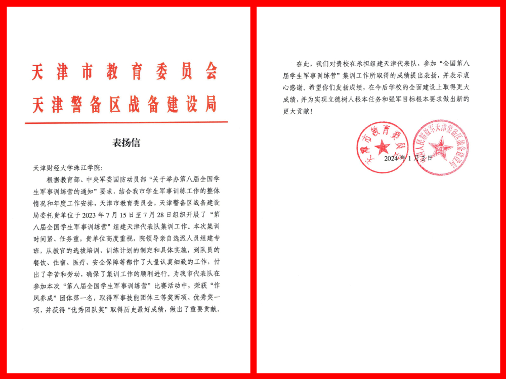 2023年市教委、警备区战备建设局向学院发来表扬信