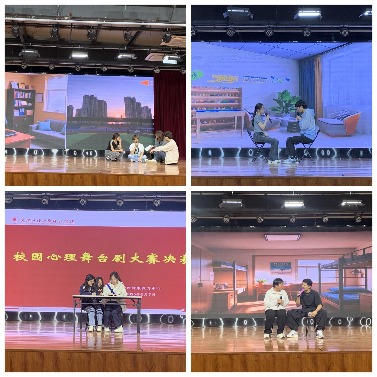 经过初赛的严格筛选,《战胜拖延,把握当下》、《学会拒绝》、《象牙塔迷障》和《星星点灯》四部作品进入本次决赛。四支学生剧组以舞台为镜,通过风格各异的原创作品,探讨大学生心理健康议题,展现成长中的困惑、挣扎与蜕变。所有演员都贡献了精湛的表演,情节跌宕起伏,扣人心弦,台下的观众们全程被演员们的表演吸引,时而欢笑鼓掌,时而陷入深思,感受心灵的触碰,体验情感的共鸣。最终,作品《象牙塔迷障》获一等奖,作品《星星点灯》获二等奖,作品《战胜拖延,把握当下》和《学会拒绝》获三等奖。人力2301班刘书昊荣获最佳男主角,国金2201班谷玥萌荣获最佳女主角。