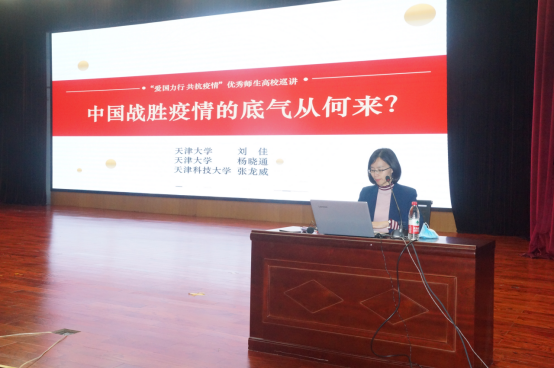 2020年11月13日下午,学生工作部邀请2019年天津市十佳辅导员天津大学刘佳老师担任主讲人,以“爱国力行共抗疫情”为题开展讲座,500余名学生代表在中和楼报告厅聆听讲座。