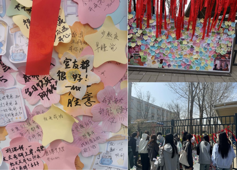 活动现场,同学们纷纷在精心准备的彩色标签纸上写下自己在宿舍生活中的温暖故事、对室友的感谢以及对未来的美好祝愿。“感谢室友在我生病时的细心照顾”“XX宿舍的宝子们超级好”“愿我们毕业时仍能保持这份真挚的友情”“愿考研顺利、前程似锦”等等……一条条真挚的留言贴满了展板,传递着同窗情谊的温暖与感动,传达对家人、对朋友的爱与祝福。此外,活动还设置了“书写并悬挂祈福带”环节,同学们可以亲手将自己的美好祝福与心愿写在祈福带上,悬挂在特意准备的绳子上,让一条条寓意着喜气与祝愿的红带随风飘扬,形成了园区内一道独特的风景线,鼓舞激励着来往的学生们。