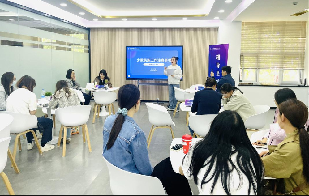 美合日班·玉苏普通过解读铸牢中华民族共同体意识理论,结合《高校少数民族学生教育管理服务指南》等文件要求,围绕少数民族学生的思想引领、学业帮扶、生活关怀、文化融合等四个维度展开讲解。结合工作经验和优秀案例,针对少数民族学生学业困难,生活习惯与校园管理等个性化需求,提出学生干部“一对一”结对帮扶制,节假日特色活动策划的工作思路。她指出,针对少数民族学生特点和工作实际,要形成“平等不特殊、严格不严苛”的教育理念,确定“无差别管理、针对性教育、人性化服务”的少数民族学生管理服务工作思路。