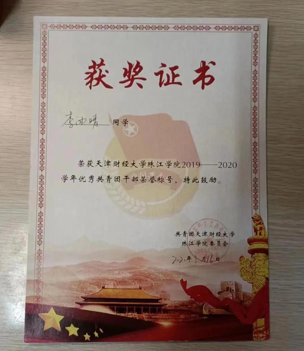 2020-2021学年中,荣获天津市优秀学生荣誉称号