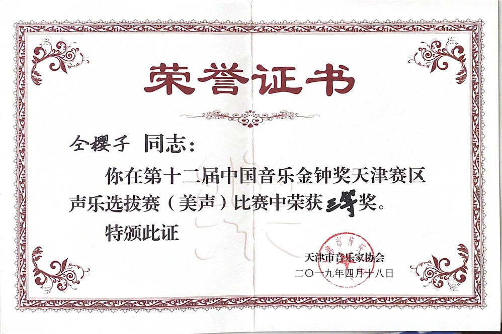 第十二届中国音乐金钟奖天津赛区声乐选拔赛美声比赛天津市三等奖