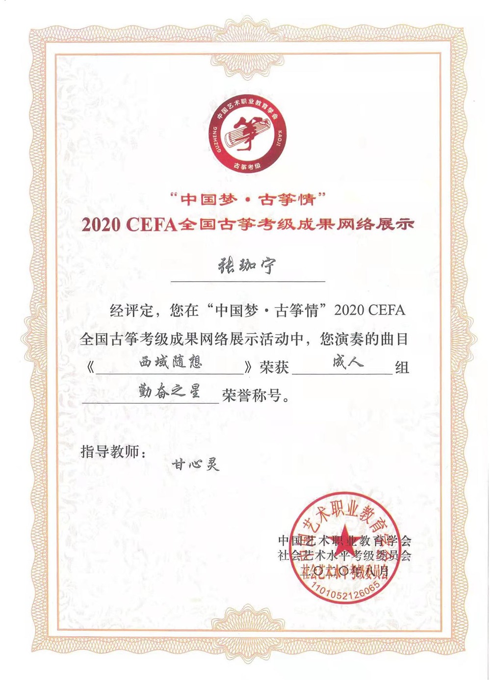 中国梦·古筝情”2020CEFA全国古筝考级成果网络展示活动奖成人组“勤奋之星”