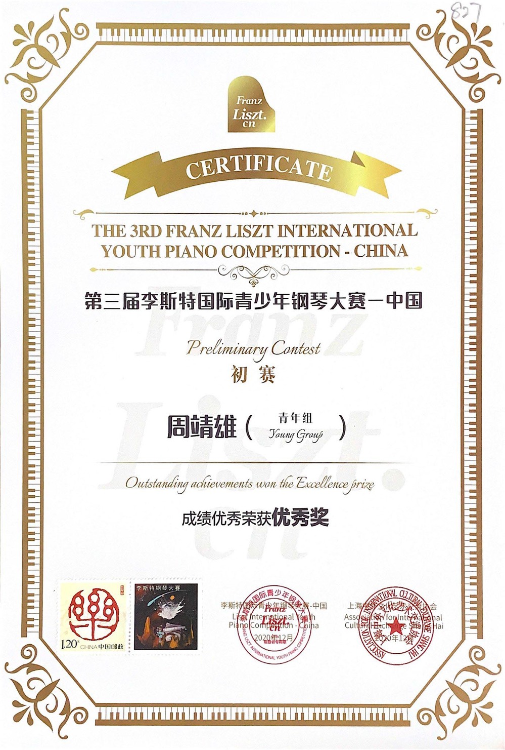 第三届李斯特国际青少年钢琴公开赛优秀奖