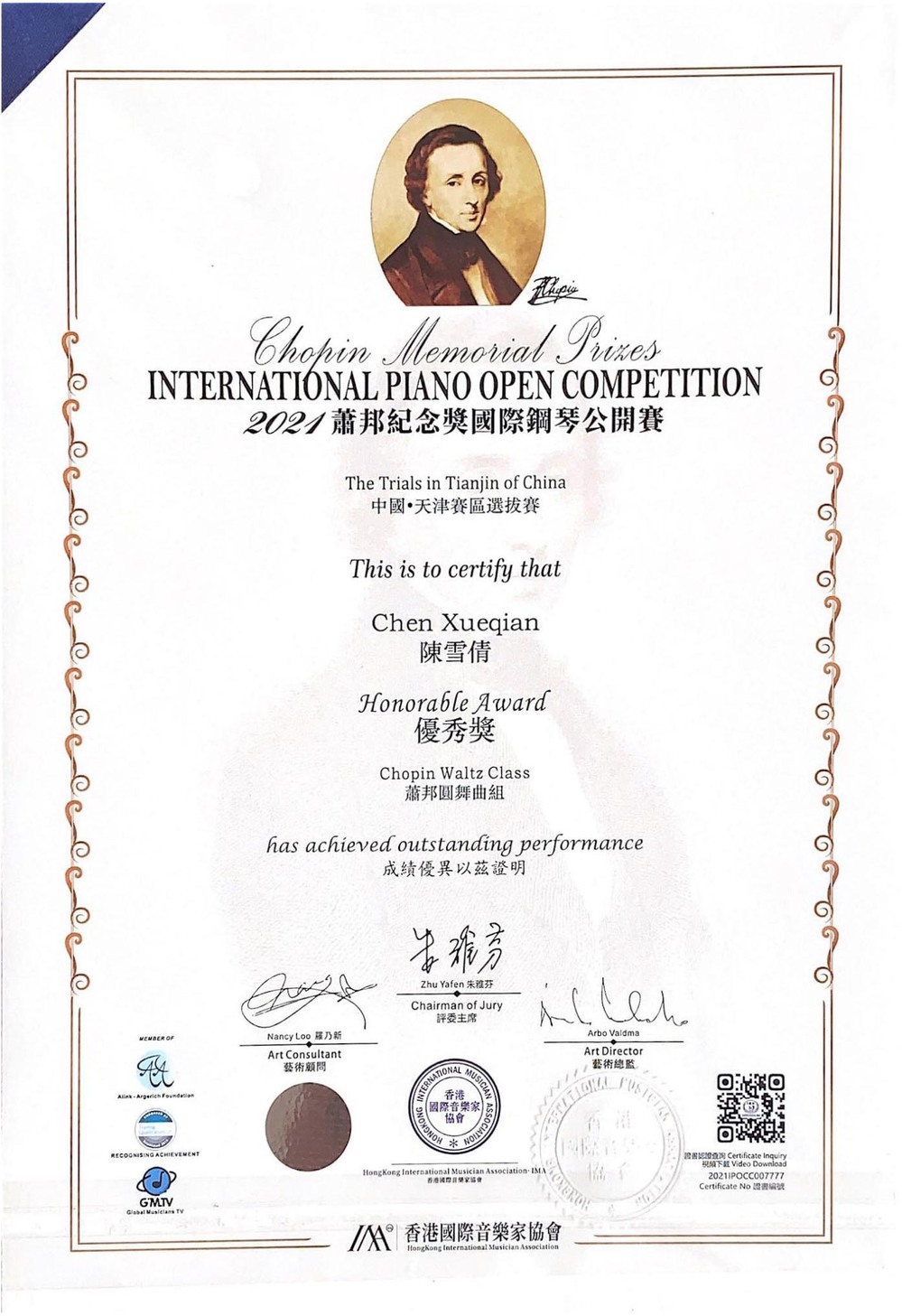 2021肖邦纪念奖国际钢琴公开赛天津赛区优秀奖