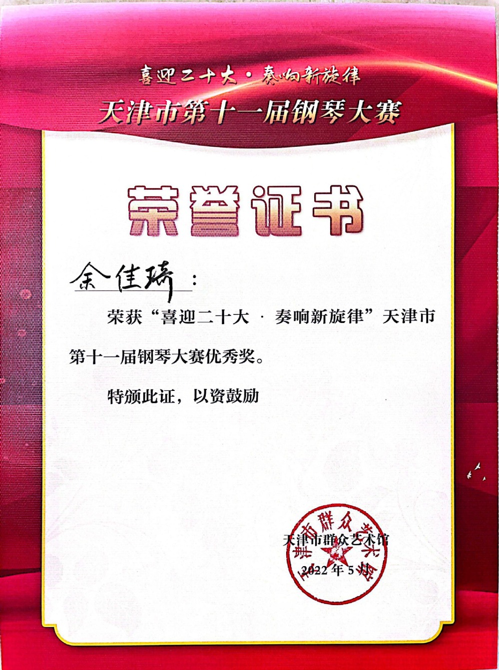 天津市第十一届钢琴大赛优秀奖