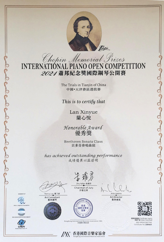2021肖邦纪念奖国际钢琴公开赛天津赛区优秀奖2