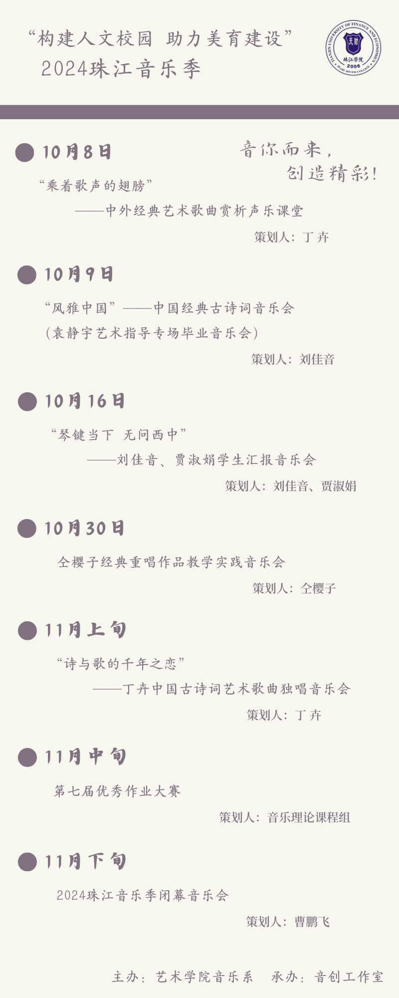 “自2021年起,音乐系师生自主策划、组织、执行的音乐美育实践活动累计30余场,内容涵盖钢琴、声乐、音乐学文论、合唱、合奏、音乐教学法等多门专业核心课程。该系列活动在学院引起广泛关注,营造了浓厚的美育氛围,激发了学生爱美向善、明德求真的品质,形成了“一校多品”的珠江美育发展新局面。2024年下半年珠江音乐季系列活动又拉开了帷幕,活动以“构建人文校园,助力美育建设”为主旨,以展现音乐系美育教学成果为契机,将应用型人才培养与实践教学落到实处,也希望借此进一步推动学院美育工作的创新发展。