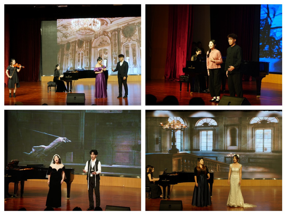 重唱是声乐演唱的重要形式之一,它将单一的主调音乐进行多声部的立体呈现,不仅检验演唱者个人的演唱技巧,更有利于塑造其审美能力,提升集体协作能力。指导教师仝樱子在声乐教学中积极探索重唱教学模式,将中外经典声乐作品进行二度创作,以二重唱、三重唱、男生小合唱、女生小合唱等多种形式对作品进行重新演绎,获得了良好的效果。音乐会涉及中外艺术歌曲、歌剧选段、民谣作品等,充分展现了学生对不同语言、风格声乐作品的驾驭能力与专业素养。此外,小提琴、长笛、吉他等乐器的巧妙融入,更体现了教师对音乐艺术表现形式的创新思考与探索,极大地增强了音乐感染力,获得了丰富的舞台效果。音乐会的尾声,全体演职人员共同演唱作品《城南送别》,音乐会在温情、祝福的氛围中被推向高潮。