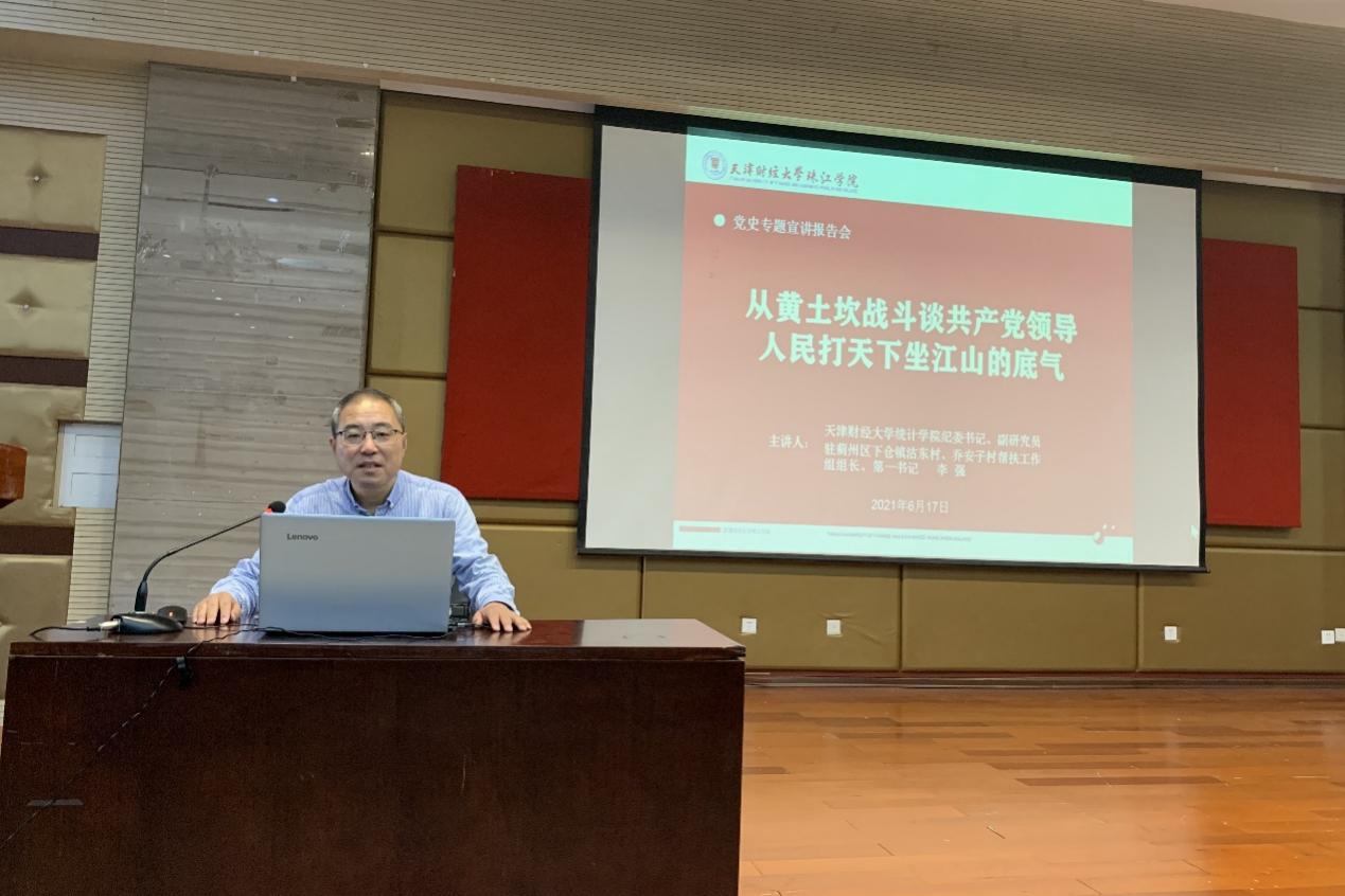 6月17日下午,yabo鸭脖官网统计学院纪委书记、副研究员,驻蓟州区下仓镇沽东村、乔安子村帮扶组组长、第一书记李强作了题为“从黄土坎战斗谈共产党领导人民打天下坐江山的底气”党史宣讲报告会。院党委书记李建航、各级党组织书记及师生党员代表共200余人听取了宣讲报告。
