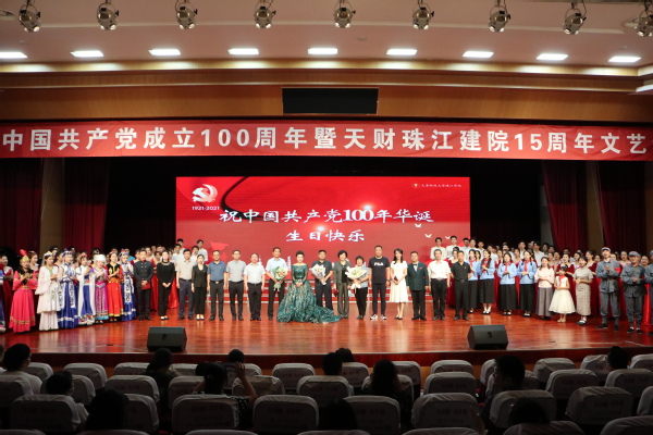 演出共分星火、征程、起航与复兴四个主题板块。演员们身着民国时期服装,以表演与合唱相结合的形式,在一曲热情洋溢的《毕业歌》与庄重严肃的《国际歌》中回忆建党过程;通过朗诵、表演及舞台剧等多种形式,再现了“长征”过程中过雪山草地的艰难、共产党人在《红色家书》中教导后代的感人故事;身着各民族服饰的演员齐聚一堂,通过欢快的歌舞形式,在全场观众明快的掌声节拍中,喜悦地唱着《翻身农奴把歌唱》及《唱支山歌给党听》等歌曲,表达着对党的感恩;音乐系丁卉老师一曲《江山》,演出进入“复兴”主题,结合庆祝建党百年,视频回顾了学院15年的发展历程及取得的成就,坚定了全院师生在党的领导下,办好服务社会、人民满意高等教育的信心和决心。管理学院院长张英华教授、科研中心主任张盘铭教授、经济学院王伟老师、数据工程学院赵翠杰老师及经济学院学生党员代表张敬易、石芹六位老、中、青党员代表共同走上舞台,诉说着他们入党不忘初心、砥砺前行的足迹与心声,表达着对党的炽爱和百年华诞的祝福,与全场观众产生了强烈的共鸣,不时发出阵阵掌声。最后,一曲《没有共产党就没有新中国》的合唱把演出推向了高潮。