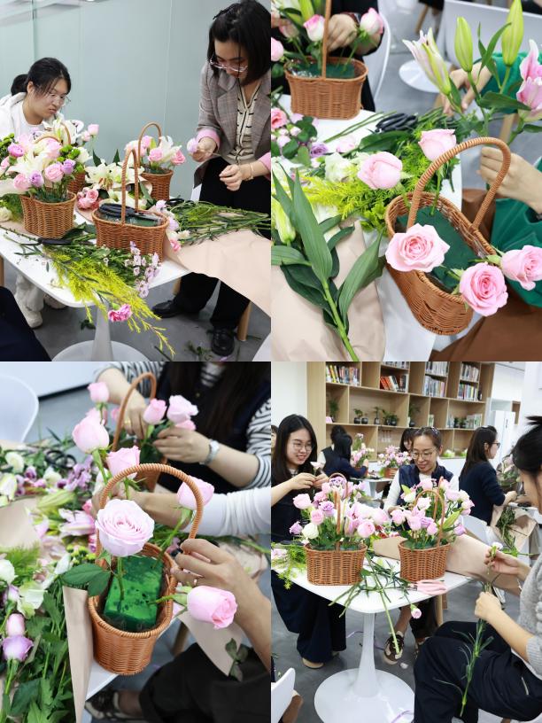 在轻松愉快的氛围中,教职工们表现出了极大的热情与创造力。大家纷纷拿起面前琳琅满目的花材,结合个人的审美巧思,动手创作属于自己的花艺作品。玫瑰的娇艳、百合的清香、康乃馨的温馨,再配以绿植的点缀,一篮篮错落有致、独具匠心的插花作品逐渐成型。讲师与助教穿插指导,教职工们相互交流借鉴,现场其乐融融。