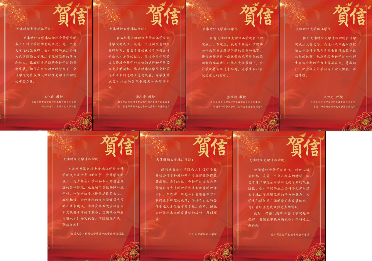 全国会计硕士专业学位教育指导委员会副主任委员、中国人民大学王化成教授,教育部工商管理类专业教学指导委员会副主任委员、原北京工商大学副校长谢志华教授,全国会计硕士专业学位教育指导委员会委员、南开大学商学院副院长、会计学系主任张继勋教授,全国会计硕士专业学位教育指导委员会委员、中南财经政法大学会计学院院长张敦力教授,全国民办本科高校会计类一流专业建设联盟,广州南方学院会计学院,天津商业大学宝德学院会计学系等领导和兄弟院校发来贺信,对会计学院的成立表示祝贺,对会计学科的建设与发展成效给予了肯定,并祝福会计学院越办越好。会计学院将与众多优秀高校携手前行,乘势而上,积极参与到会计学科的各类组织和活动中,促进会计学科专业的融合发展。