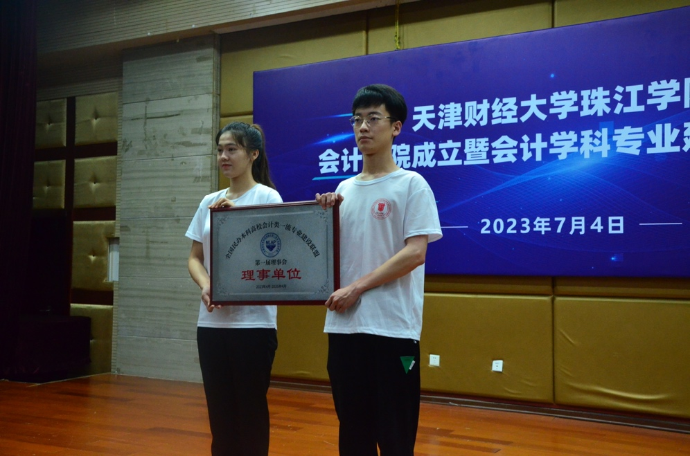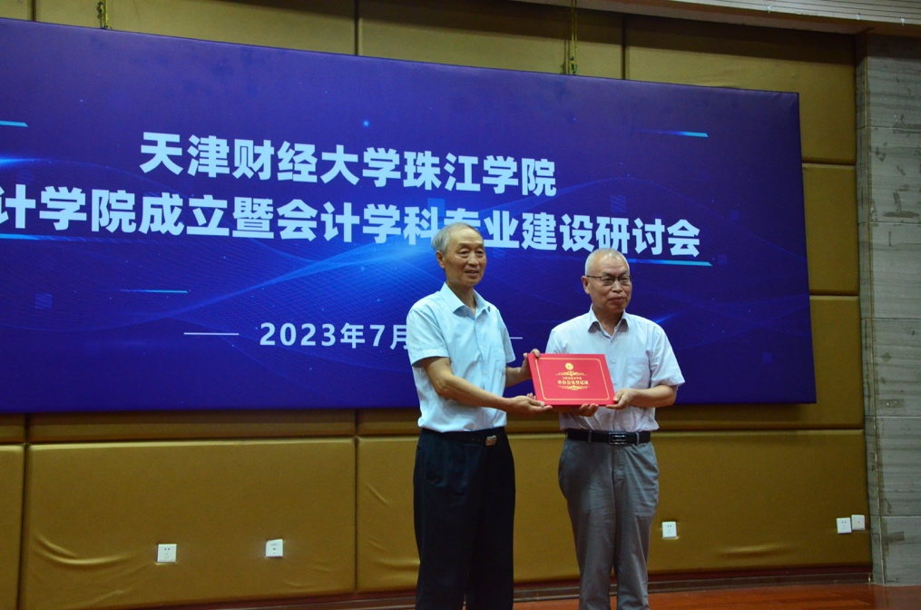 在加入天津市会计学会和全国民办本科高校会计类一流专业建设联盟的仪式环节,天津市会计学会副会长裴富才先生为会计学院颁发了单位会员证书;现场展示了全国民办本科高校会计类一流专业建设联盟为会计学院颁发的联盟理事单位铭牌。
