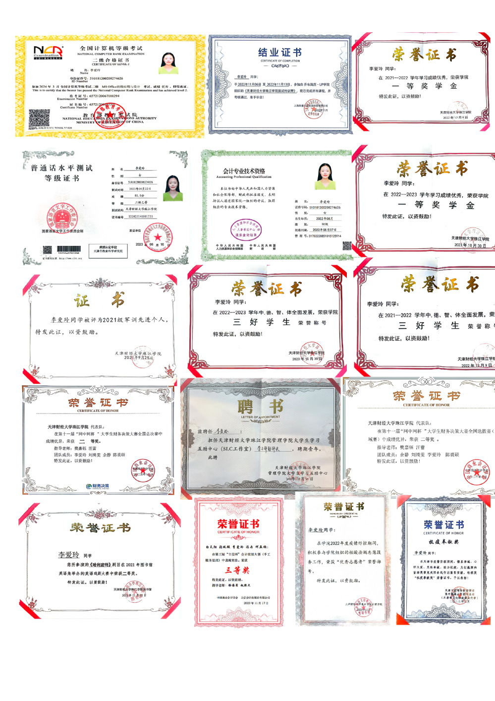 1.2023-2024学年获天津市人民政府奖学金;