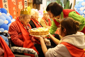 文艺表演后的生日会环节,师生们为九位寿星用心准备生日祝福视频。随着生日歌的旋律响起,大家齐声歌唱,为老寿星们送上最真挚的祝福。随后,同学们切分蛋糕,将蛋糕分送到每位老人手中。老人们洋溢的幸福笑容,正是将敬老情怀融入温情之中的生动体现。