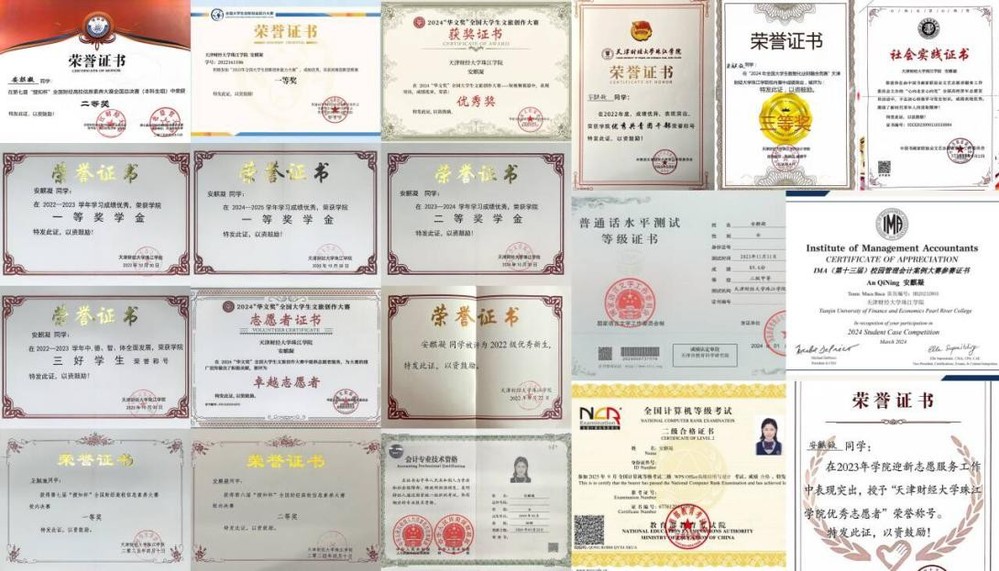 在学习中,她始终保持着精益求精的态度,课堂上紧跟老师思路,课后认真梳理知识点,学业成绩稳居班级前列。在校期间拿下学院一等奖学金、二等奖学金,考取会计初级专业技术资格证书、全国计算机二级证书;在竞赛中,她积极参与各类财经类、创新创业类赛事,斩获第七届“搜知杯”全国财经高校信息素养大赛全国总决赛二等奖、2023年全国大学生创新创业能力大赛创新思维赛一等奖等多个奖项。