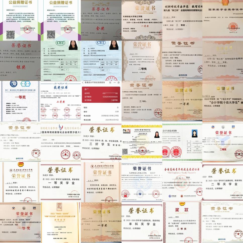 在学习中,她以“勤”为笔深耕学业,凭借扎实基础,一次性通过初级会计专业技术资格考试、全国计算机等级考试二级,拿下全国大学英语四、六级证书。在校期间,学业上连续三年斩获学院奖学金、单科奖学金,获评“三好学生”。在竞赛中,荣获第十二届全国大学生财务决策大赛国赛一等奖、科云杯全国大学生财会职业能力大赛国家二等奖、第十九届全国高等院校数智化企业经营沙盘大赛市赛特等奖、第十一届能源经济大赛天津赛区一等奖、第十八届“挑战杯”中国银行天津市大学生课外学术科技竞赛市二等奖等。